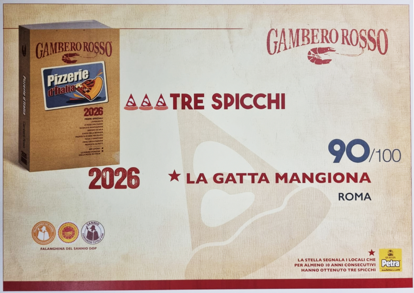 Per il 13° anno consecutivo La Gatta Mangiona conquista i 3 spicchi sulla Guida Pizzerie d’Italia del Gambero Rosso!