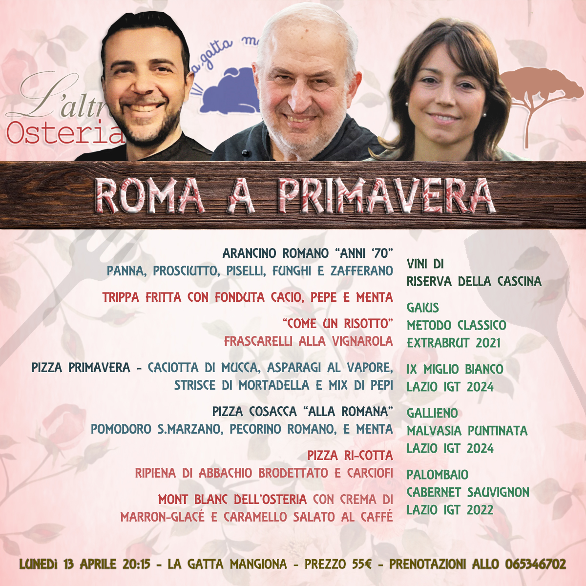 Chiuso l’inverno con una bellissima serata-evento, apriamo allo stesso modo la primavera, questa volta in compagnia di due giovani e affermatissimi professionisti del settore: la mano di Gianpiero Tomei de L’Altra Osteria e i vini di Silvia Brannetti della Riserva della Cascina. Ci vediamo il 13 aprile, come al solito a La Gatta Mangiona!